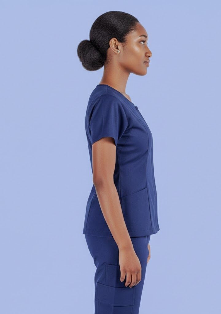 A modern scrub set designed for women, featuring a crossover top for enhanced comfort and mobility, ideal for medical, clinical, and healthcare work environments.